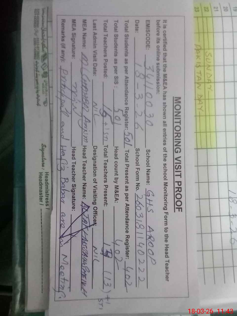 | Attendance Register | Head Teacher | MEA with School | Visit Proof |