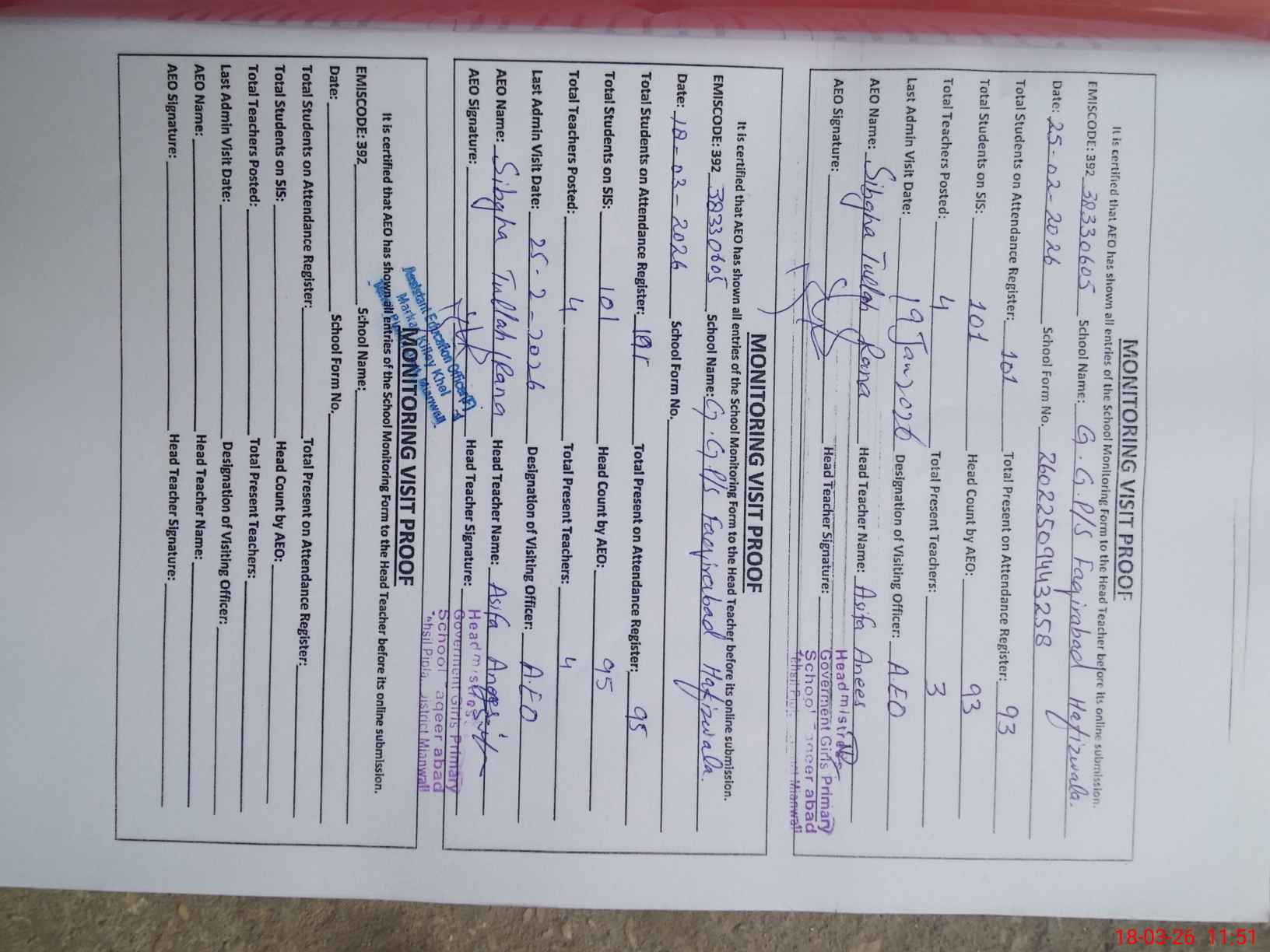 | Attendance Register | Head Teacher | MEA with School | Visit Proof |