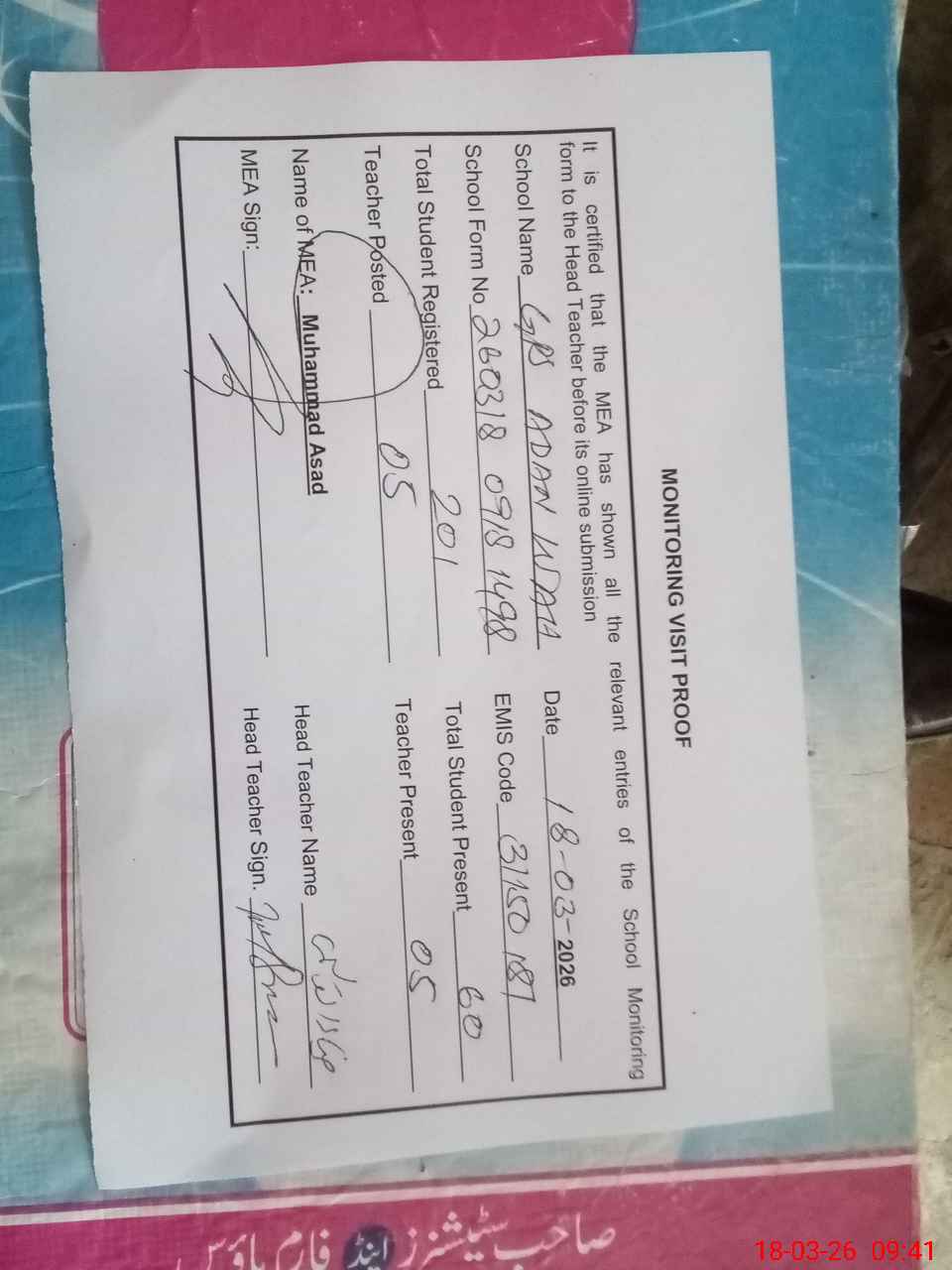 | Attendance Register | Head Teacher | MEA with School | Visit Proof |