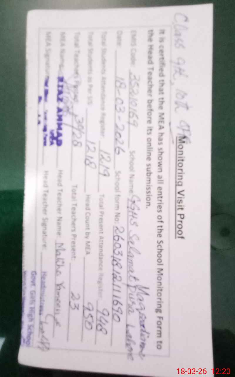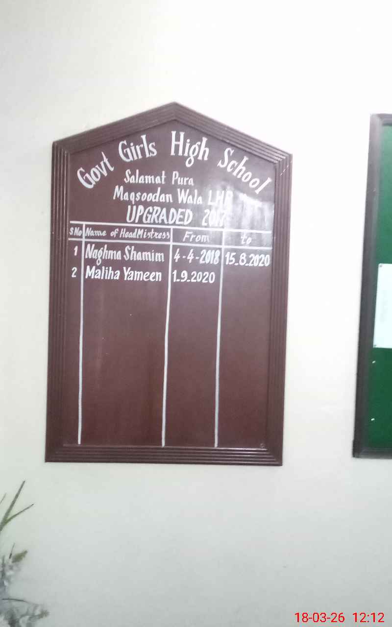 | EMIS Code: 35210169 | Name of School: GGHS SALAMAT PURA MAQSOODAN WALA | |||