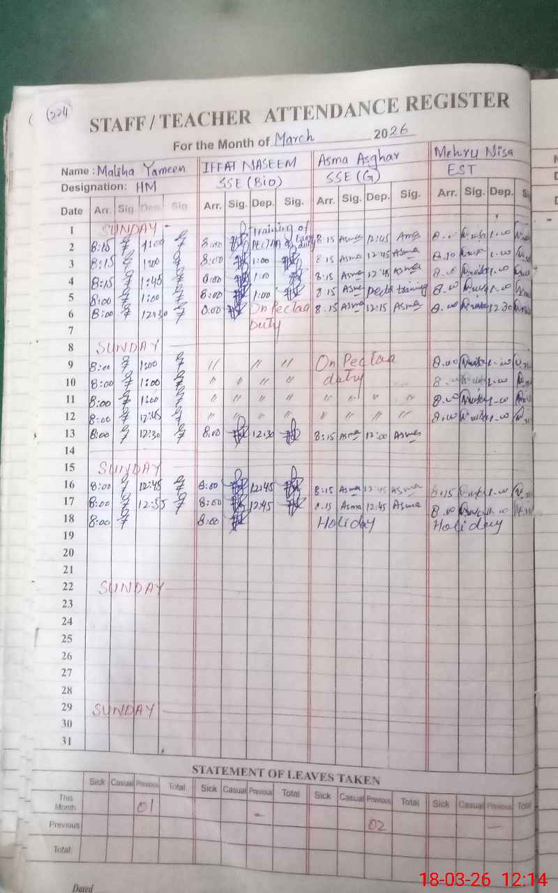 | Remarks (Use Separate Page if Required): AEO visited this school on 11/03/26. No other administrative visit since long. Class 9, 10 is on exame off today. Total teachers= 28 Present today=23 others are on holidays announced by the government w e f 10/03/26. | |||||