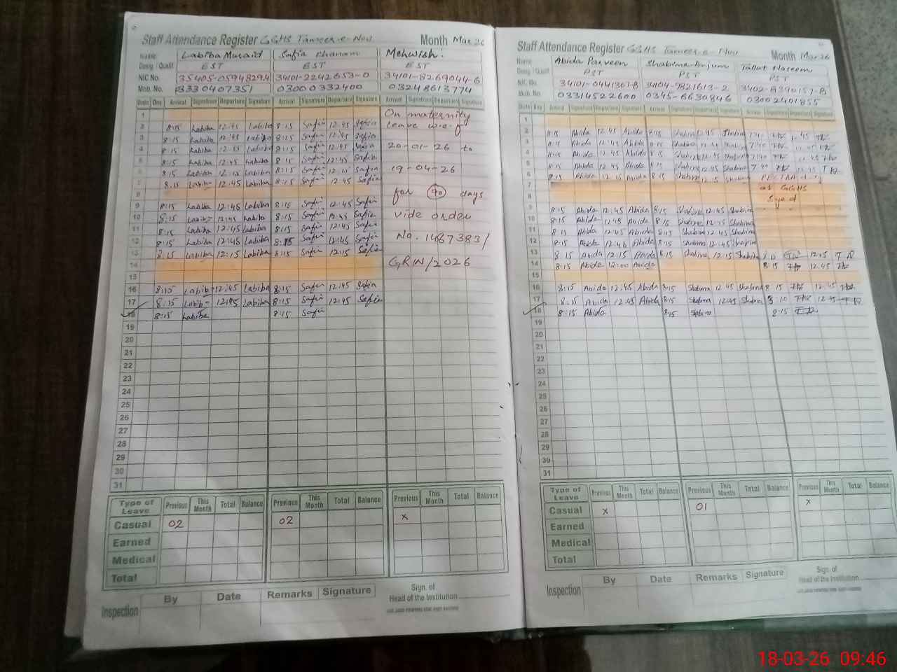 | 33**** | Na**** Ra**** | PST Science/Maths | Regular | 28 | 0 | 0 | 28 | 0 | 0 | 0 | 0 | 0 | Maternity |