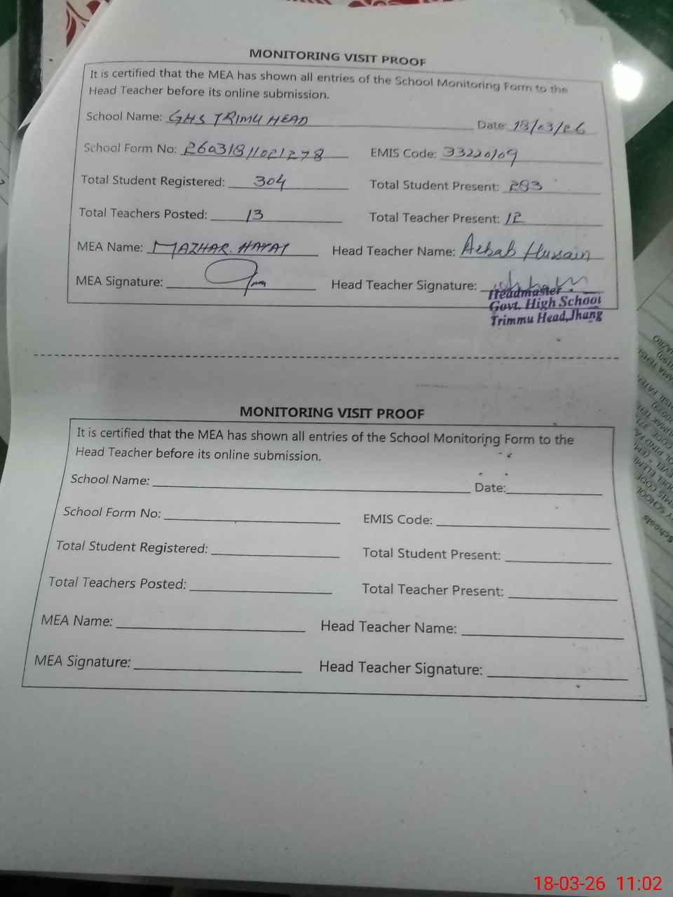 | Attendance Register | Head Teacher | MEA with School | Visit Proof |