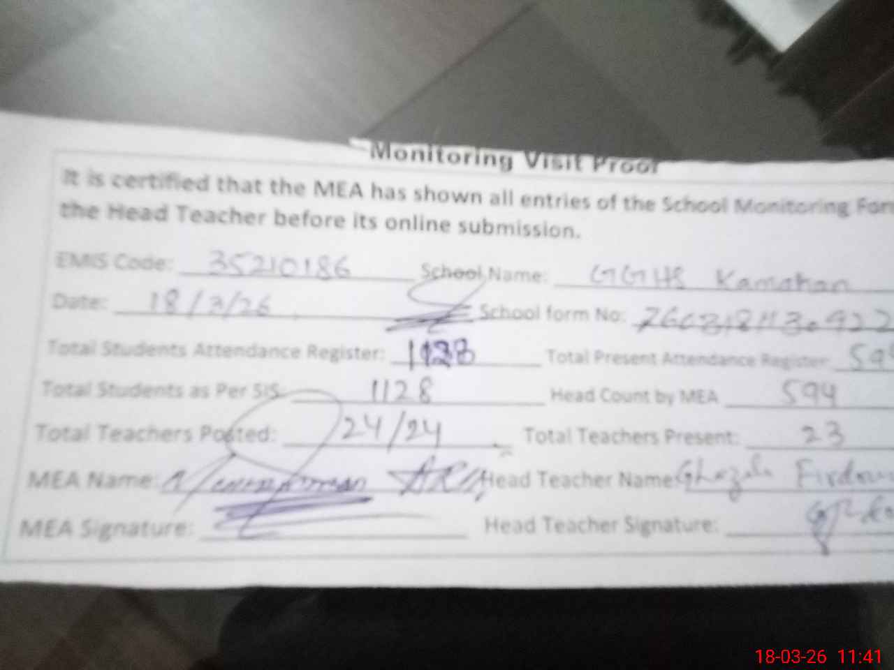 | Attendance Register | Head Teacher | MEA with School | Visit Proof |