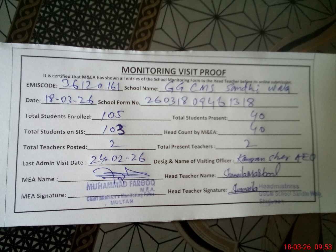 | Attendance Register | Head Teacher | MEA with School | Visit Proof |