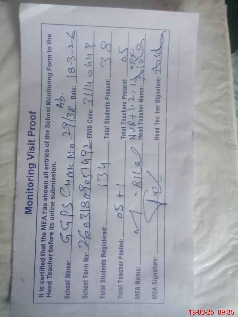 | Attendance Register | Head Teacher | MEA with School | Visit Proof |