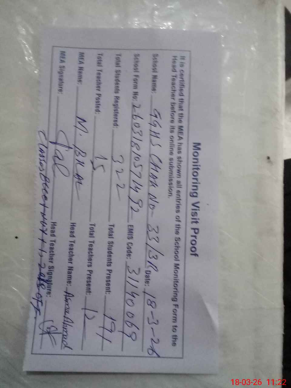 | Name: AS**** AH**** Designation: (School Headmaster's/Headmistress's) S.S.T. SCI Phone/Cell Number: 03**** |