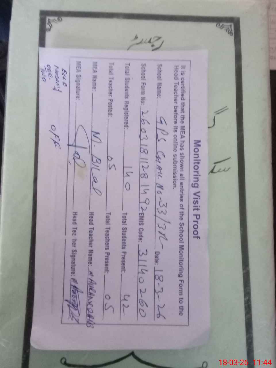 | Attendance Register | Head Teacher | MEA with School | Visit Proof |
