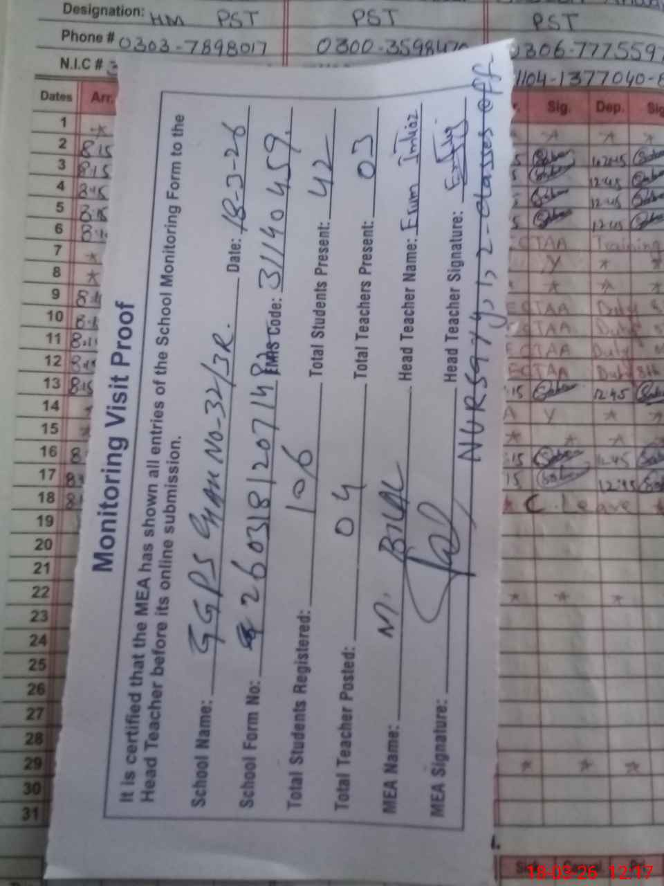 | Attendance Register | Head Teacher | MEA with School | Visit Proof |