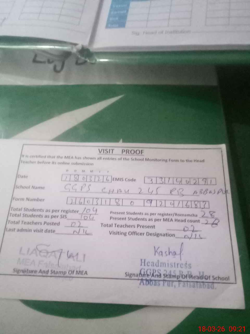 | EMIS Code: 33140291 | Name of School: GGPS CHAK 245 RB ABBAS PUR | |||