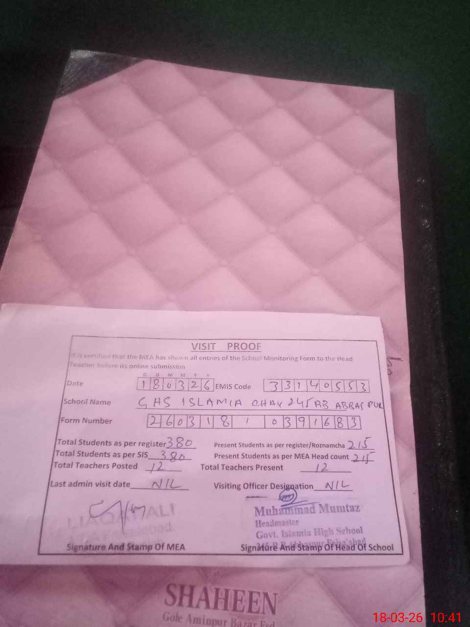 | Certified that this School was Inspected by the Undersigned MEA/DMO Today and the Information Stated Above is as Per Record. | |||||