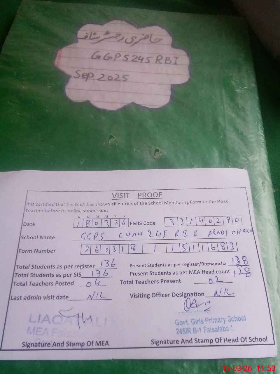 | EMIS Code: 33140290 | Name of School: GGPS CHAK 245 RB I ABADI CHAILA | |||