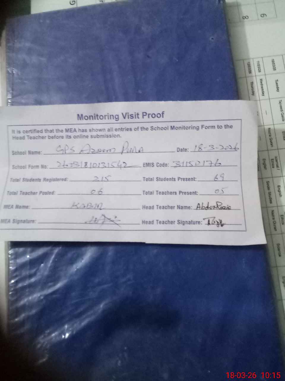 | Attendance Register | Head Teacher | MEA with School | Visit Proof |