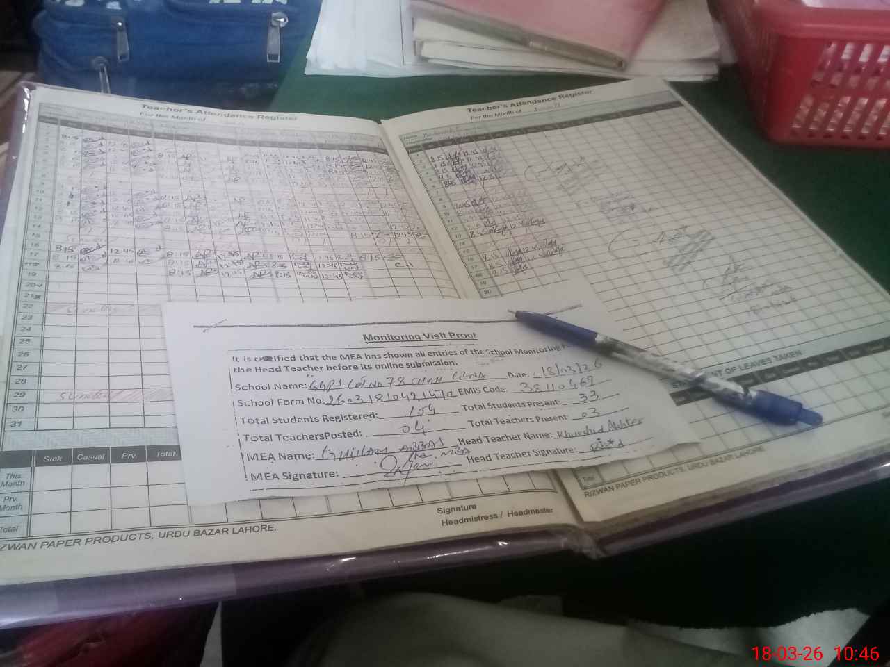 | Attendance Register | Head Teacher | MEA with School | Visit Proof |
