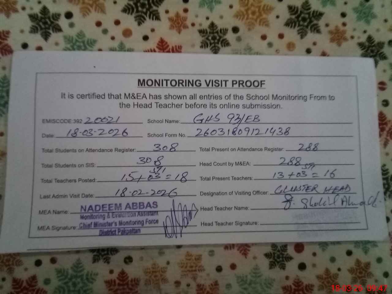 | EMIS Code: 39220021 | Name of School: GHS 93/E-B TEH ARIF WALA | |||