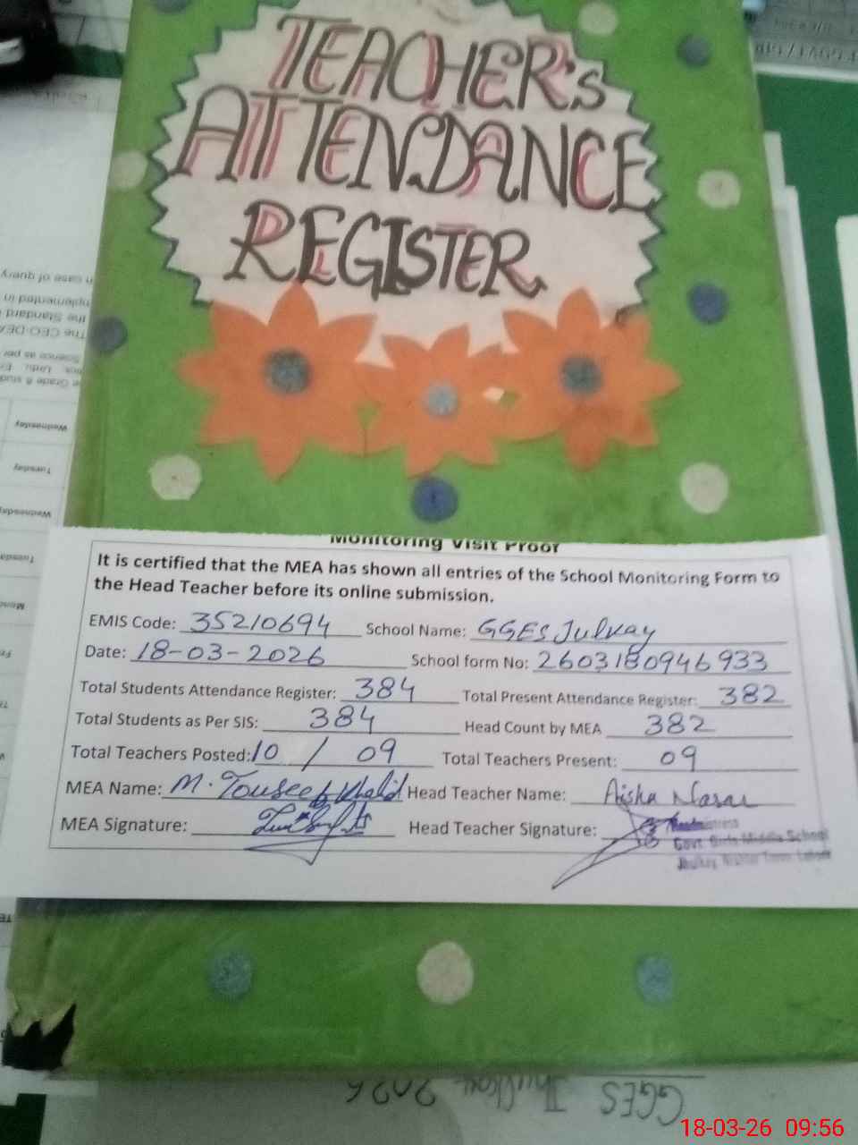 | Attendance Register | Head Teacher | MEA with School | Visit Proof |