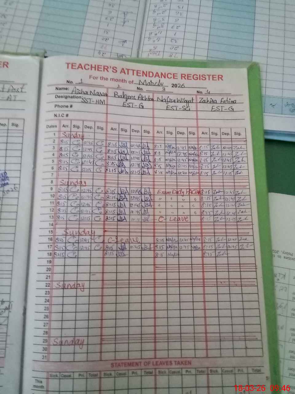 | Leave | Duty | Absent | Maternity | Medical | Ex- Pak |