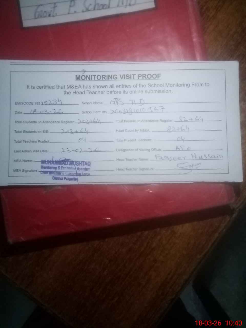 | Attendance Register | Head Teacher | MEA with School | Visit Proof |