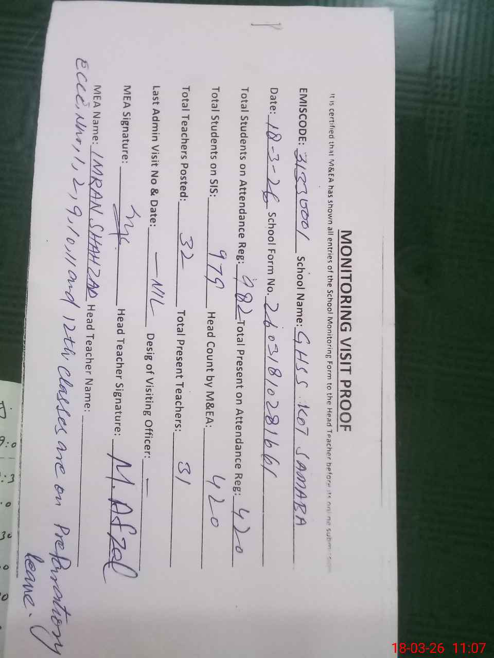 | Attendance Register | Head Teacher | MEA with School | Visit Proof |