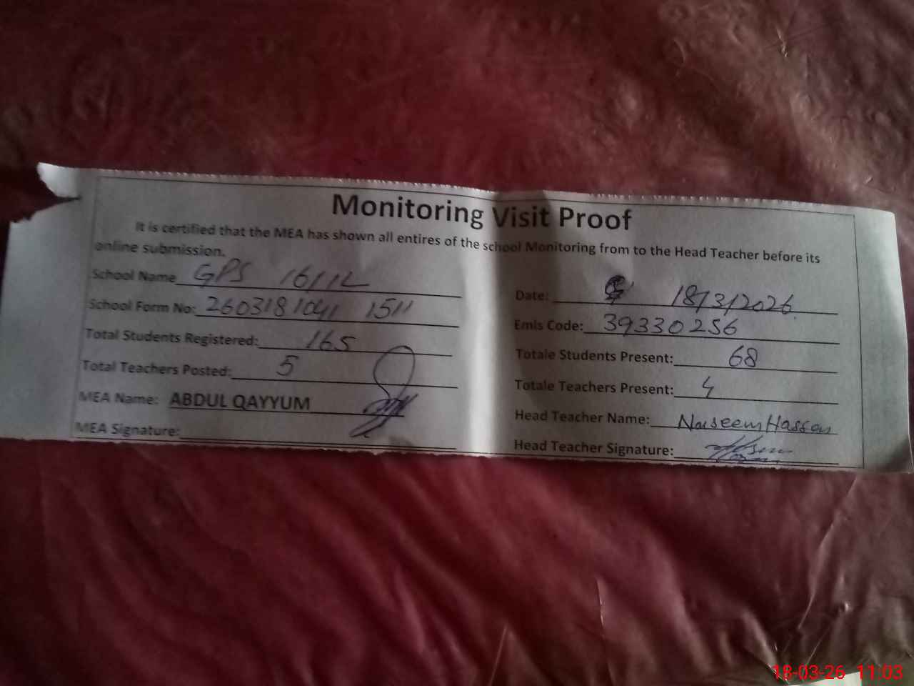 | Attendance Register | Head Teacher | MEA with School | Visit Proof |