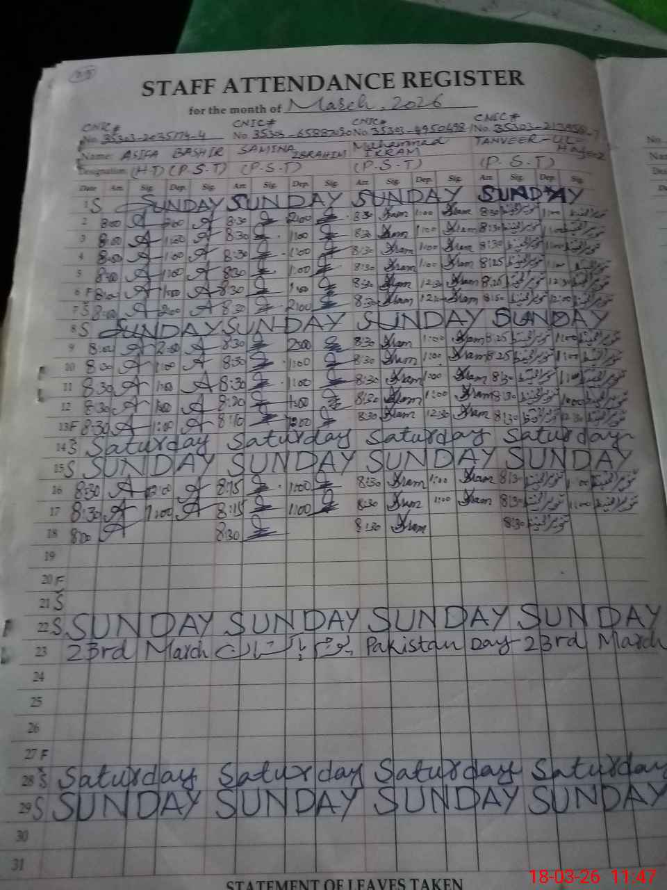 | CNIC | Full Name | Designation | R/C | Absence During Last Calender Month |