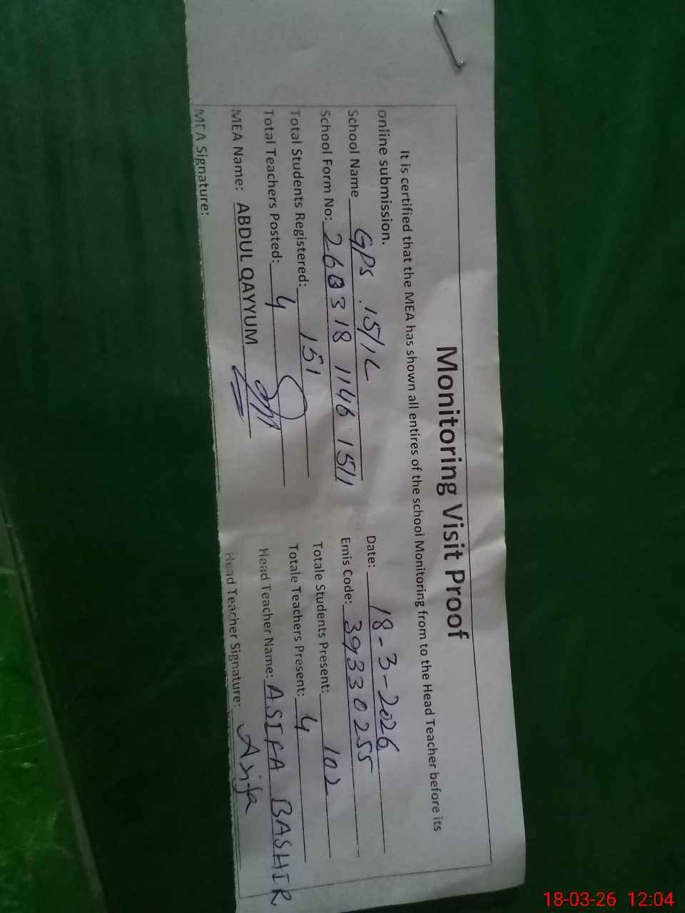 | Attendance Register | Head Teacher | MEA with School | Visit Proof |