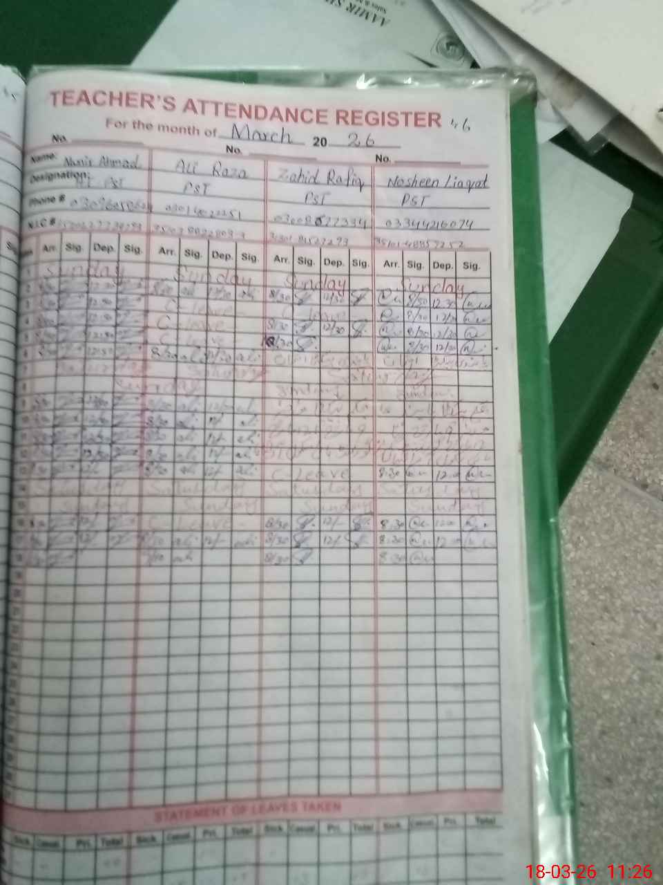 | CNIC | Full Name | Designation | R/C | Absence During Last Calender Month |