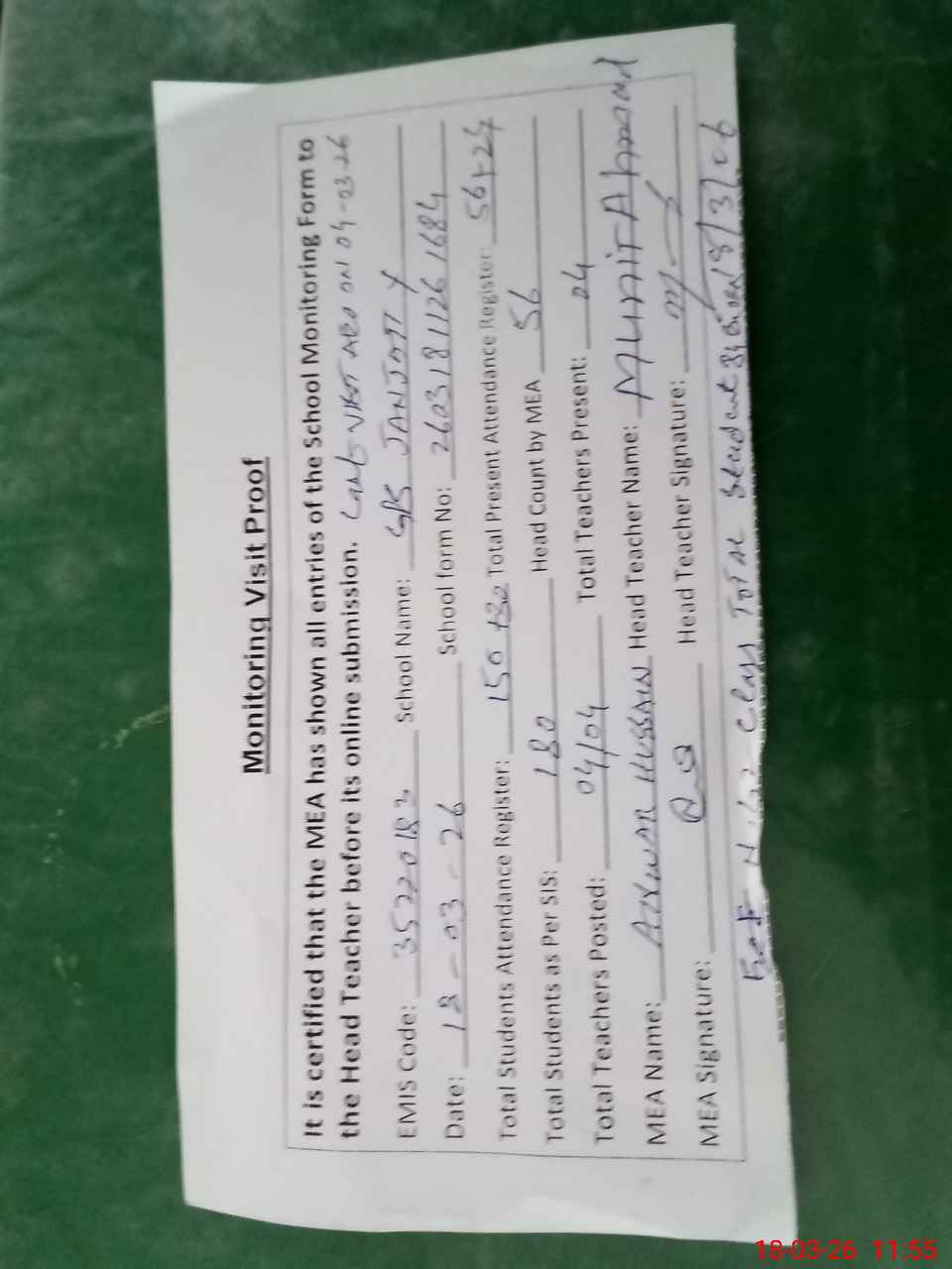 | Attendance Register | Head Teacher | MEA with School | Visit Proof |