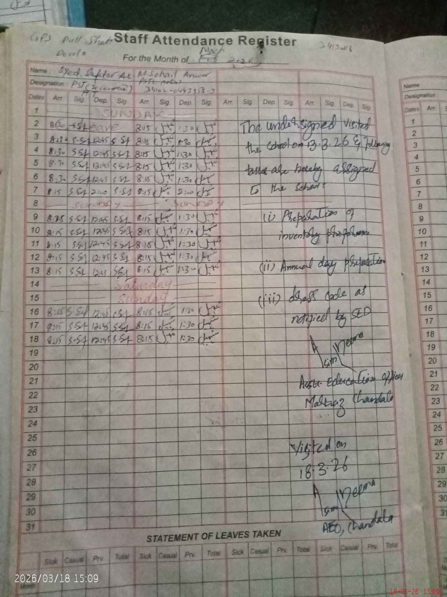 | Attendance Register | Head Teacher | MEA with School | Visit Proof |