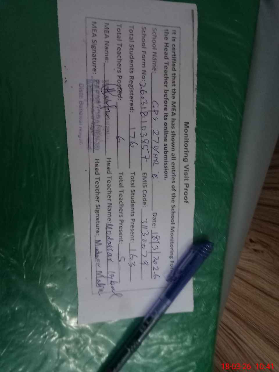 | Attendance Register | Head Teacher | MEA with School | Visit Proof |