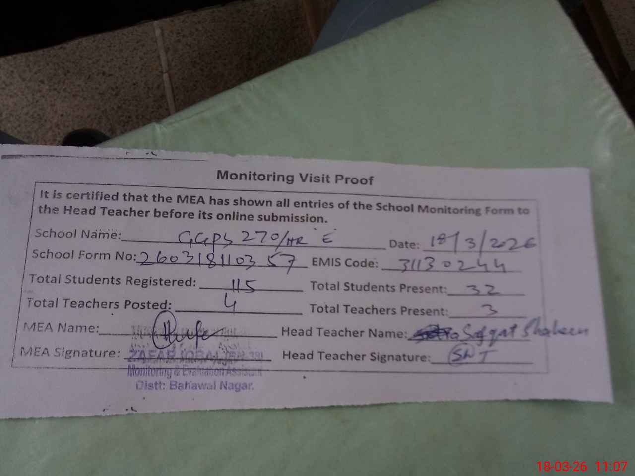 | Attendance Register | Head Teacher | MEA with School | Visit Proof |