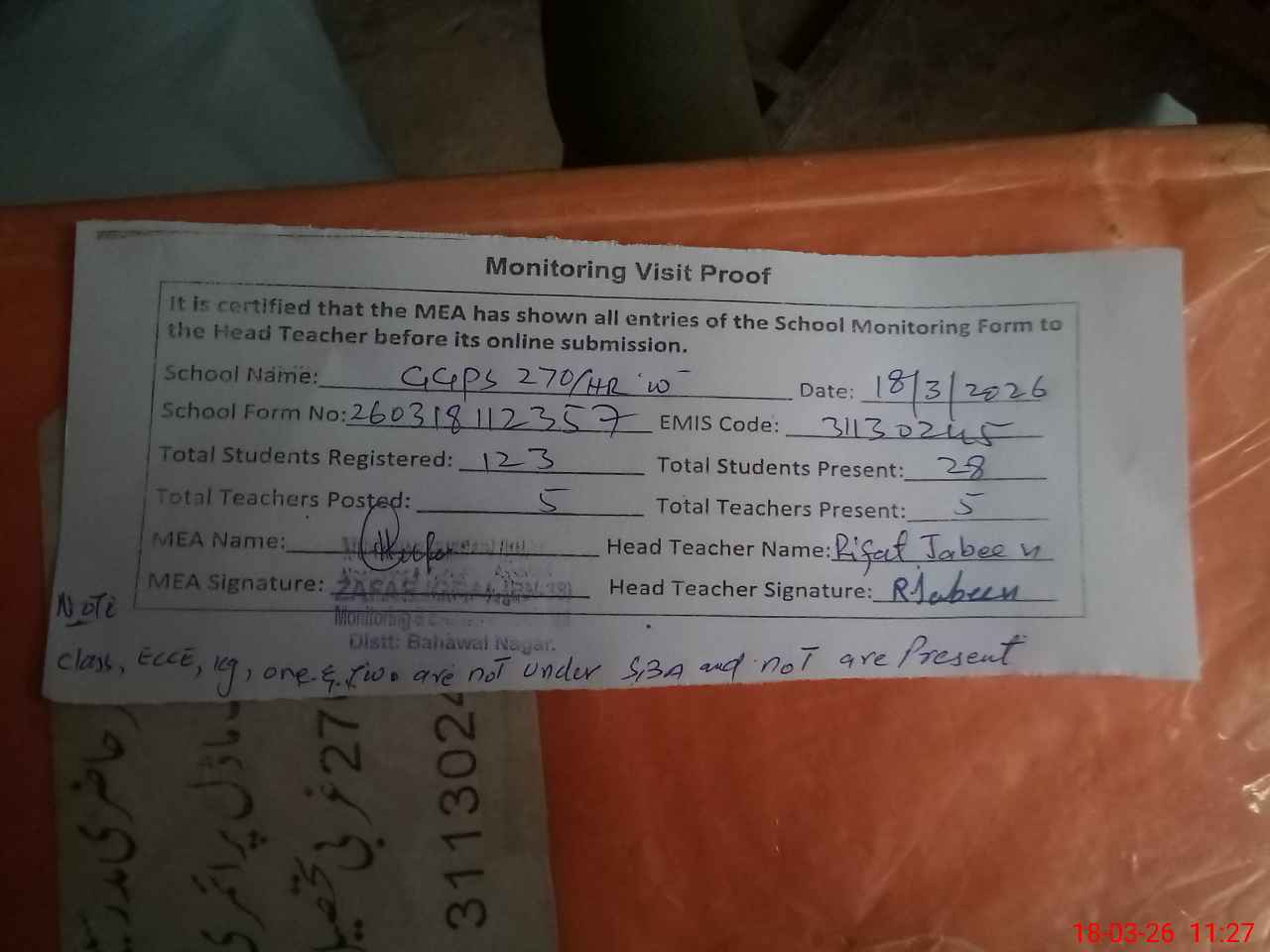 | Attendance Register | Head Teacher | MEA with School | Visit Proof |