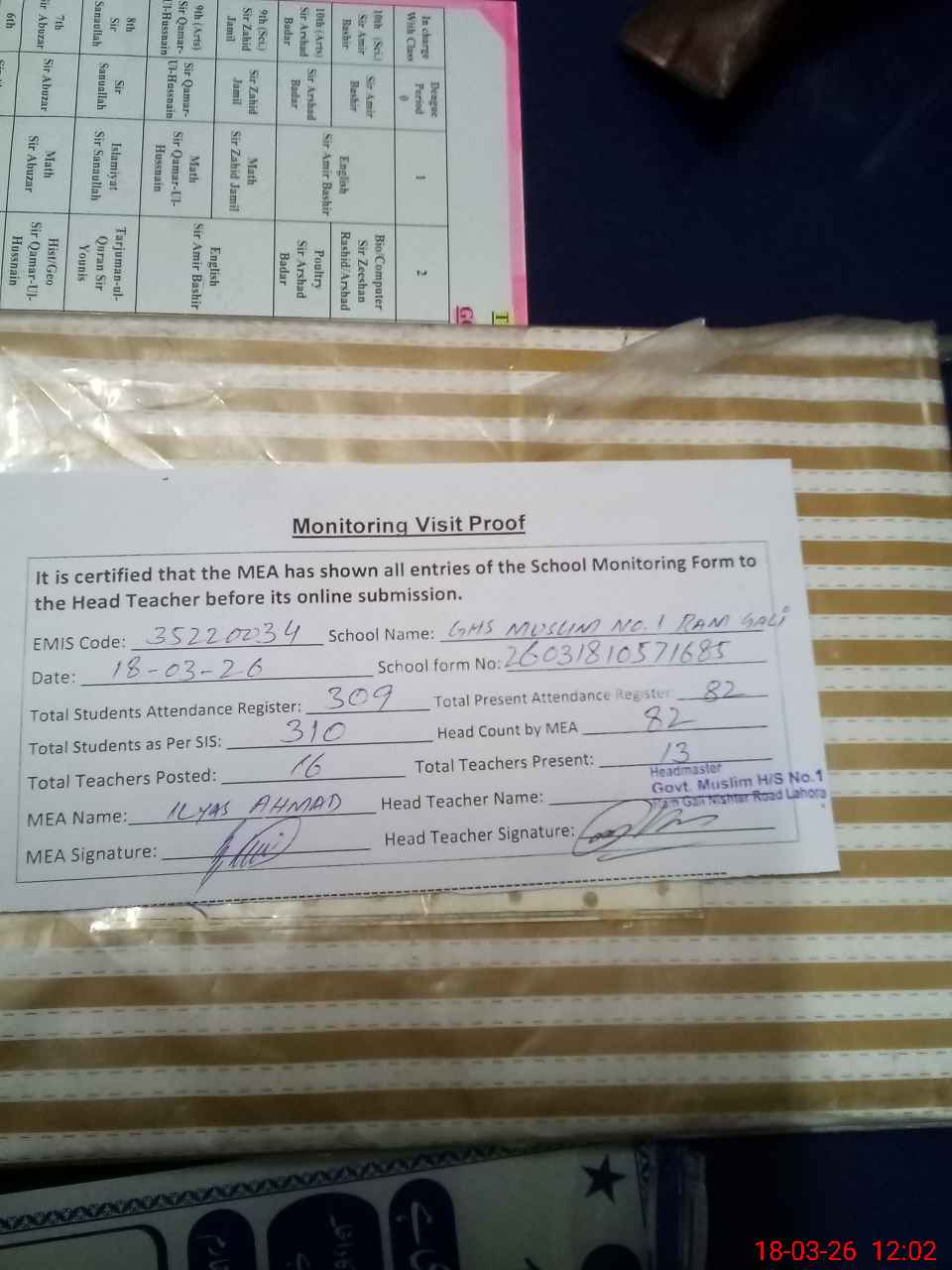 | Attendance Register | Head Teacher | MEA with School | Visit Proof |
