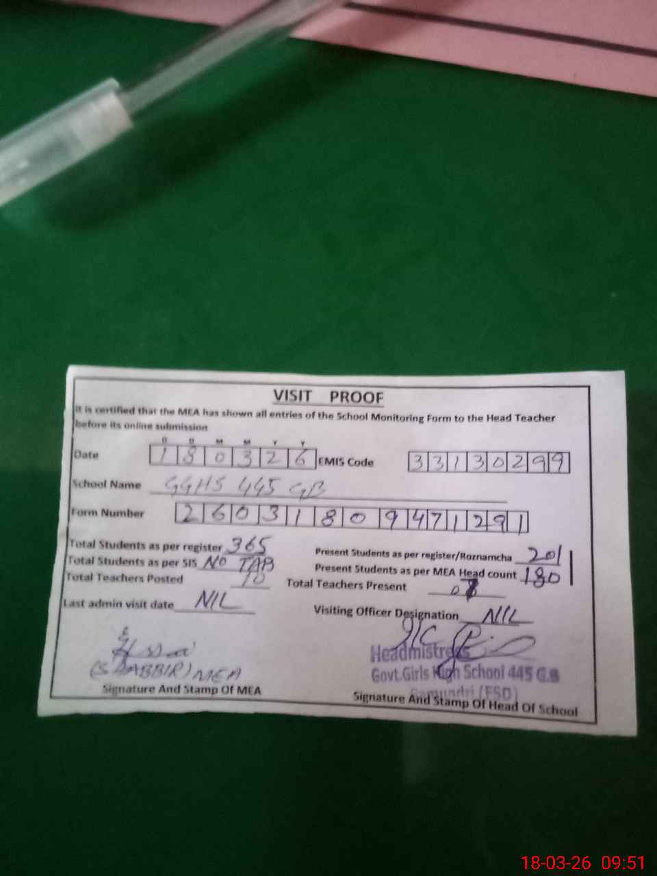 | Attendance Register | Head Teacher | MEA with School | Visit Proof |