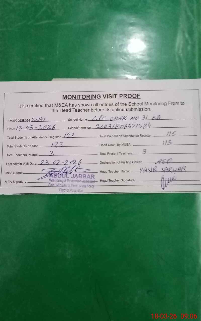 | EMIS Code: 39220141 | Name of School: GPS CHAK NO. 31 EB | |||