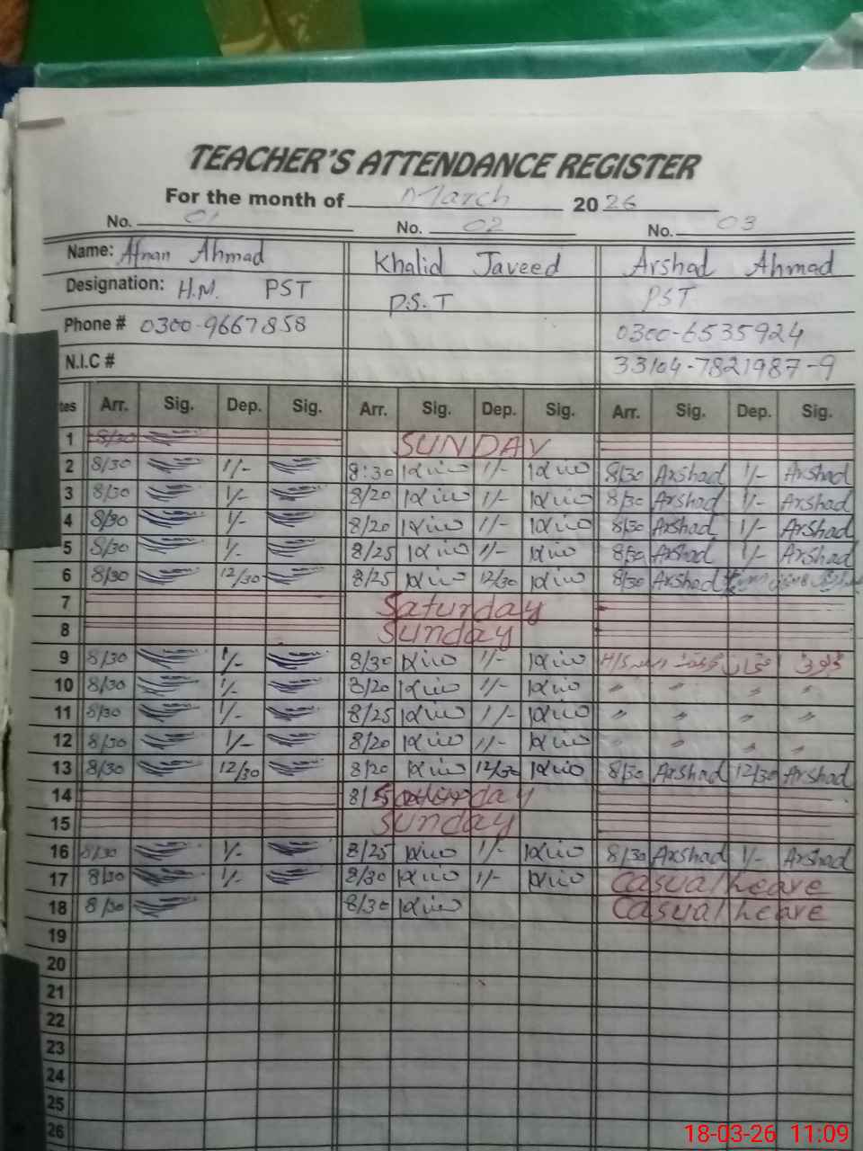 | CNIC | Full Name | Designation | R/C | Absence During Last Calender Month |