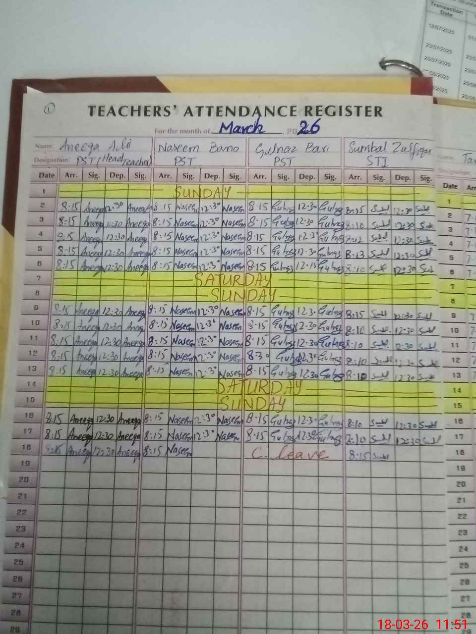 | CNIC | Full Name | Designation | R/C | Absence During Last Calender Month |