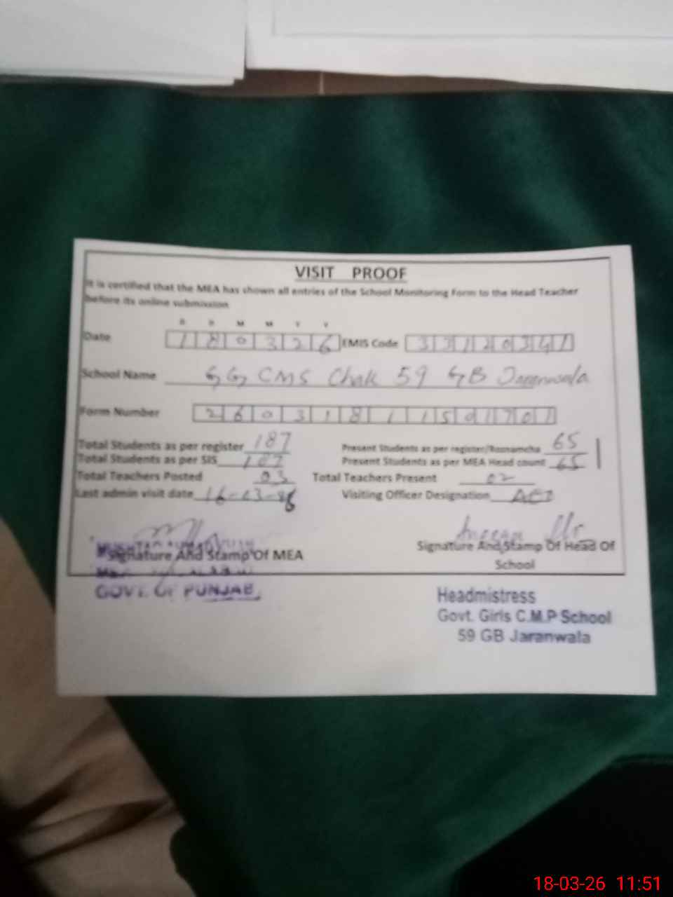 | Certified that this School was Inspected by the Undersigned MEA/DMO Today and the Information Stated Above is as Per Record. | |||||