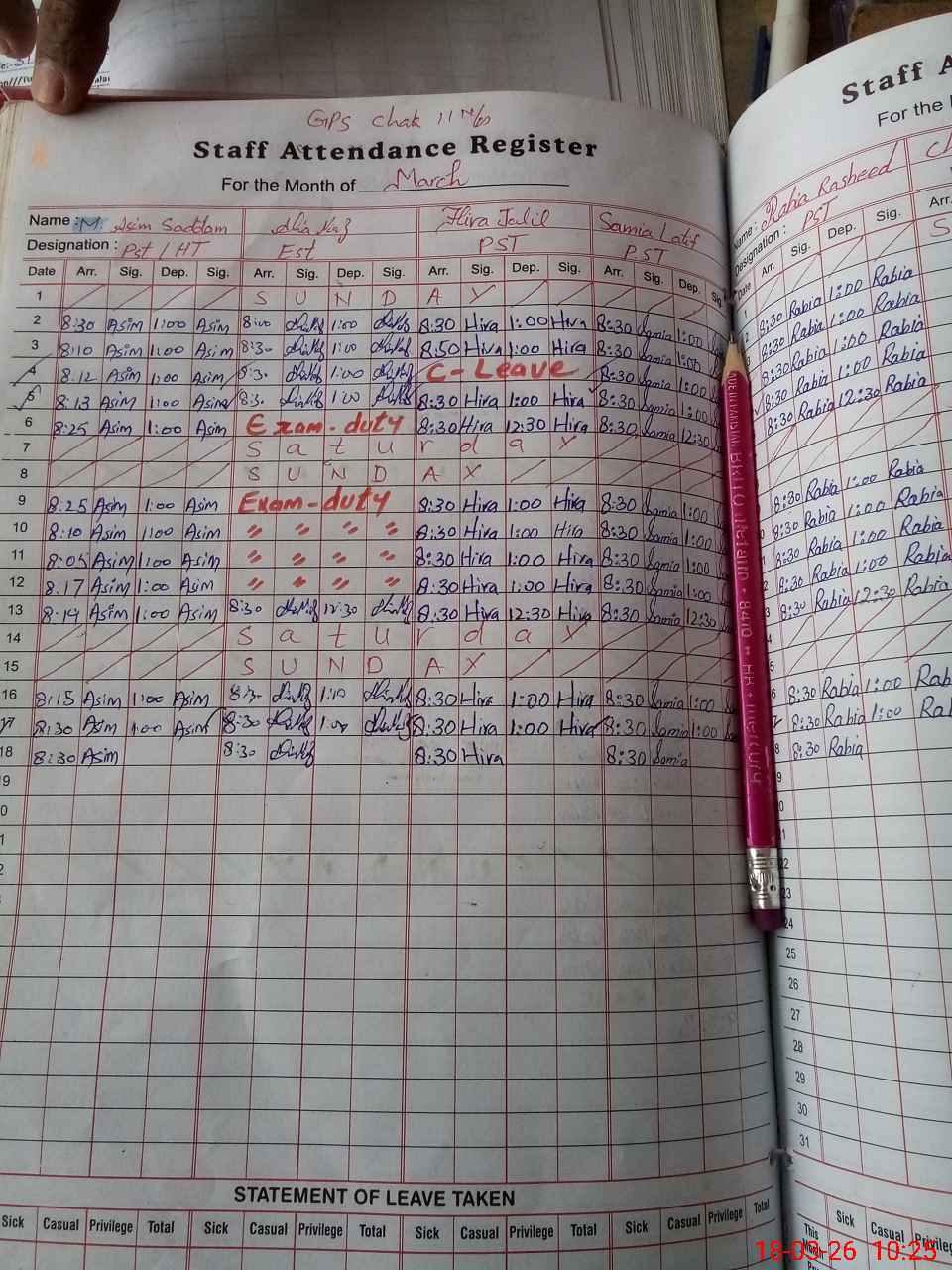 | Leave | Duty | Absent | Maternity | Medical | Ex- Pak |