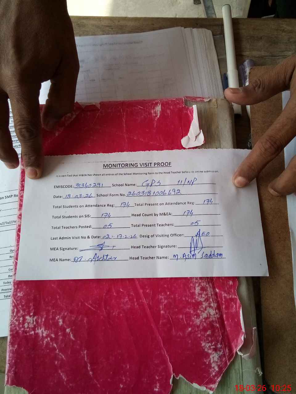 | Attendance Register | Head Teacher | MEA with School | Visit Proof |