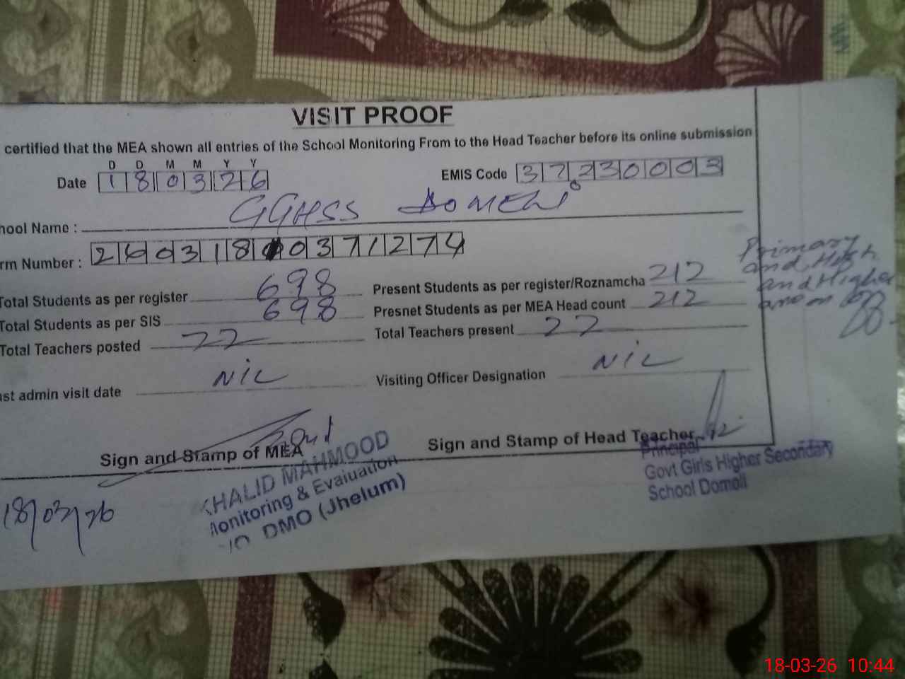 | Certified that this School was Inspected by the Undersigned MEA/DMO Today and the Information Stated Above is as Per Record. | |||||