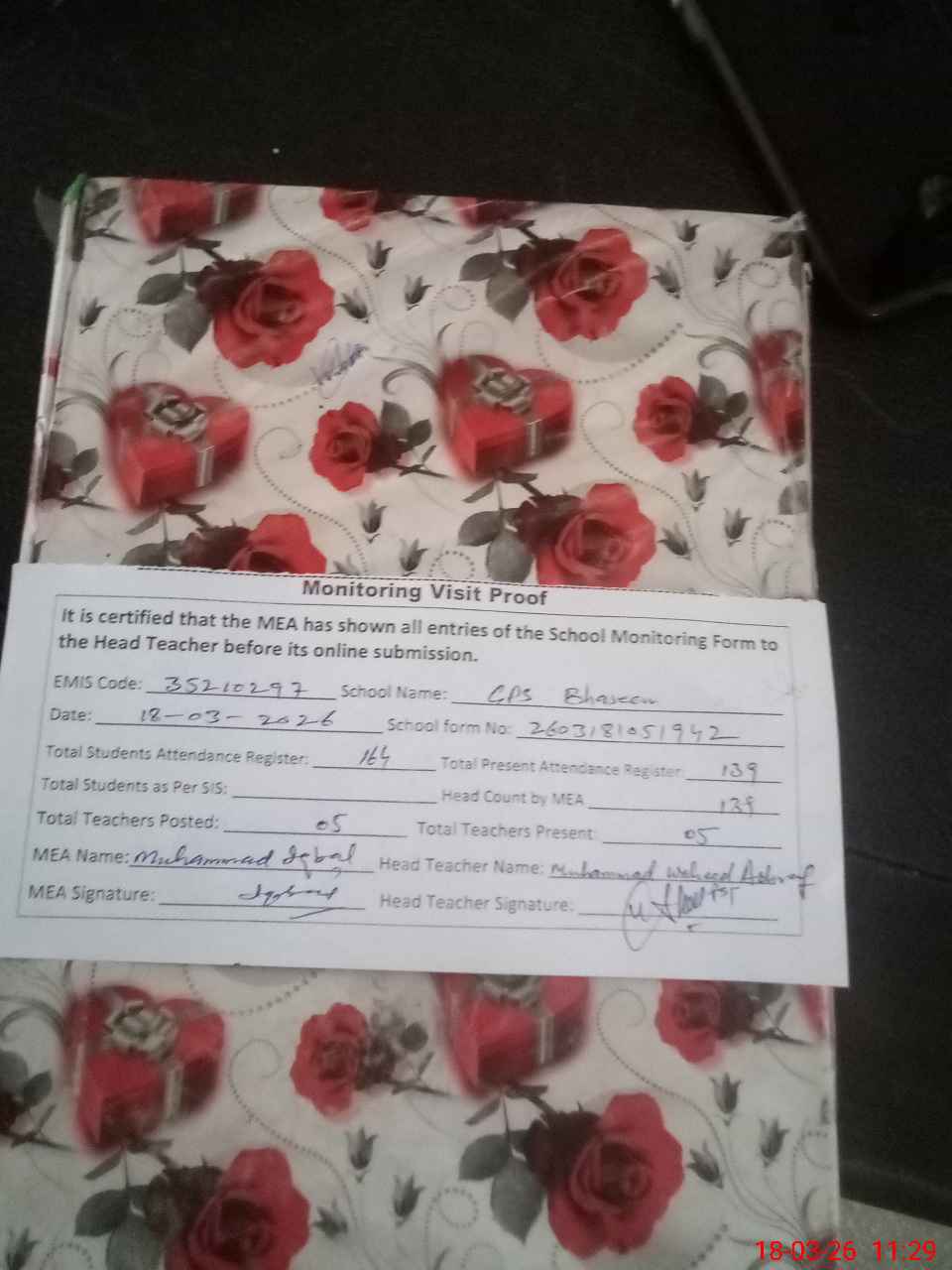 | Attendance Register | Head Teacher | MEA with School | Visit Proof |
