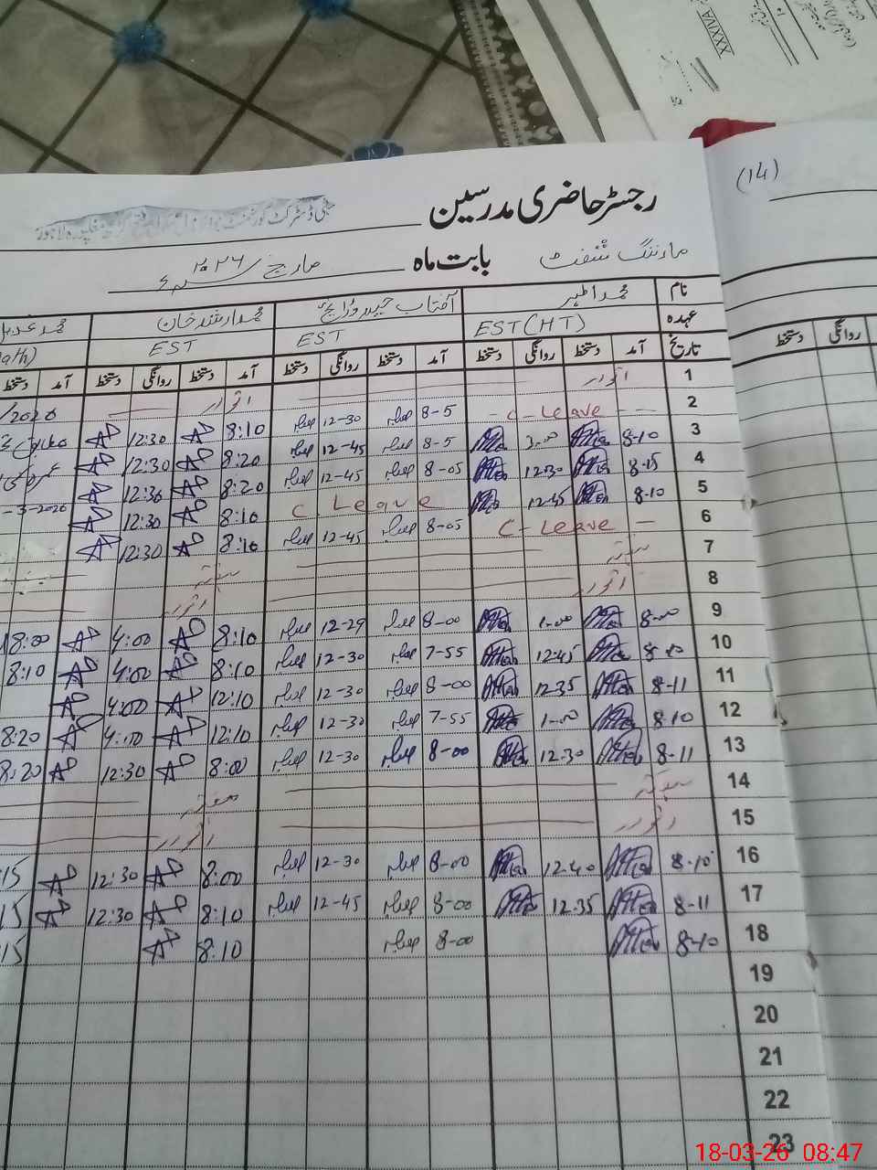 | CNIC | Full Name | Designation | R/C | Absence During Last Calender Month |