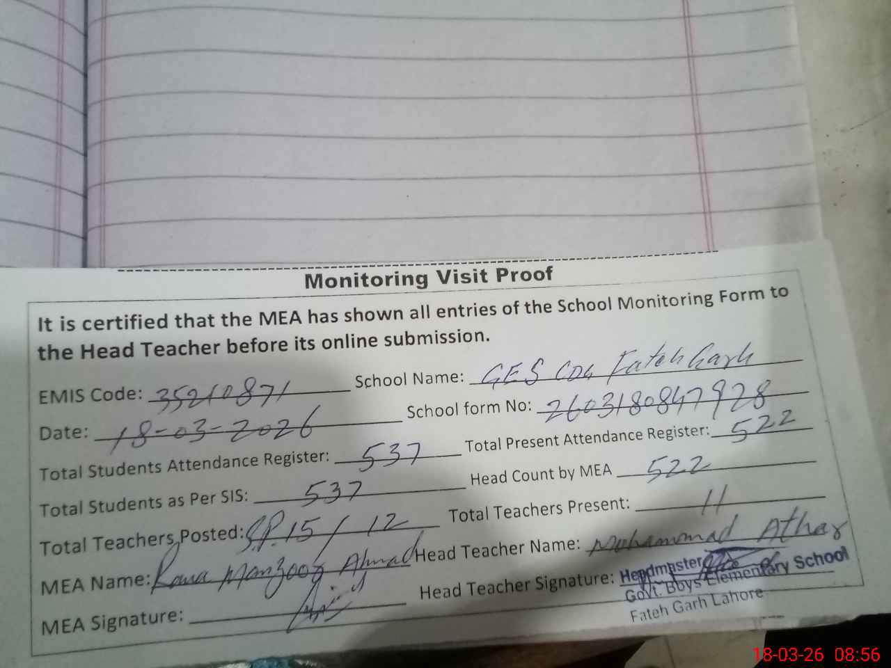 | Attendance Register | Head Teacher | MEA with School | Visit Proof |