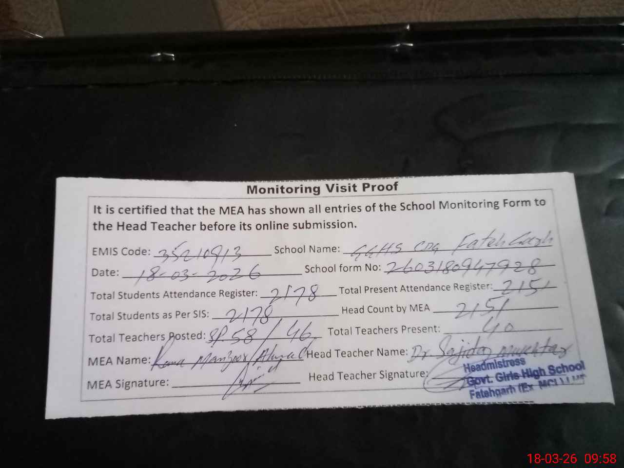 | Attendance Register | Head Teacher | MEA with School | Visit Proof |