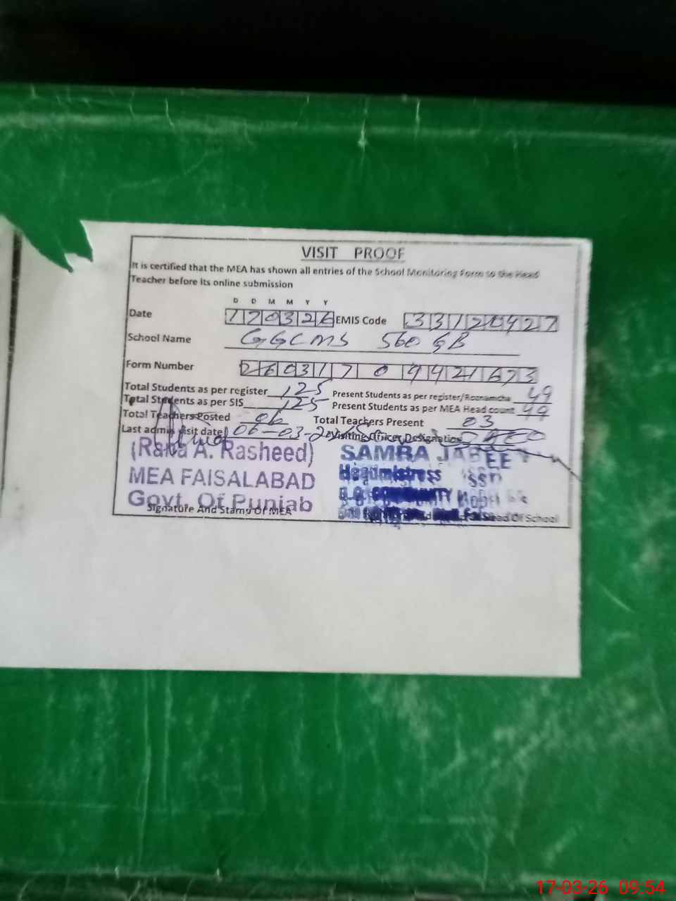 | Attendance Register | Head Teacher | MEA with School | Visit Proof |