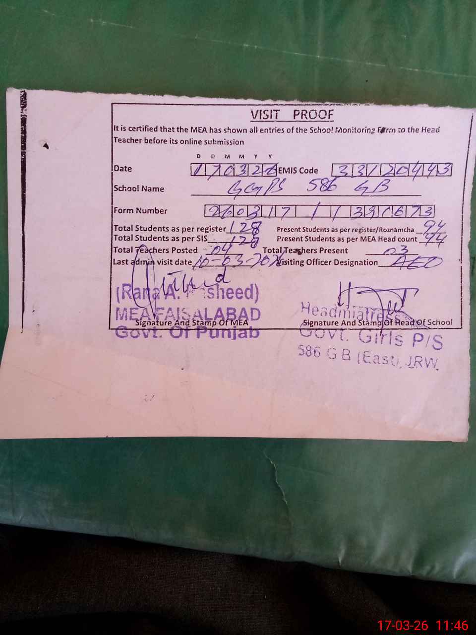 | EMIS Code: 33120443 | Name of School: GGPS CHAK 586 GB LUNDIANWALA | |||