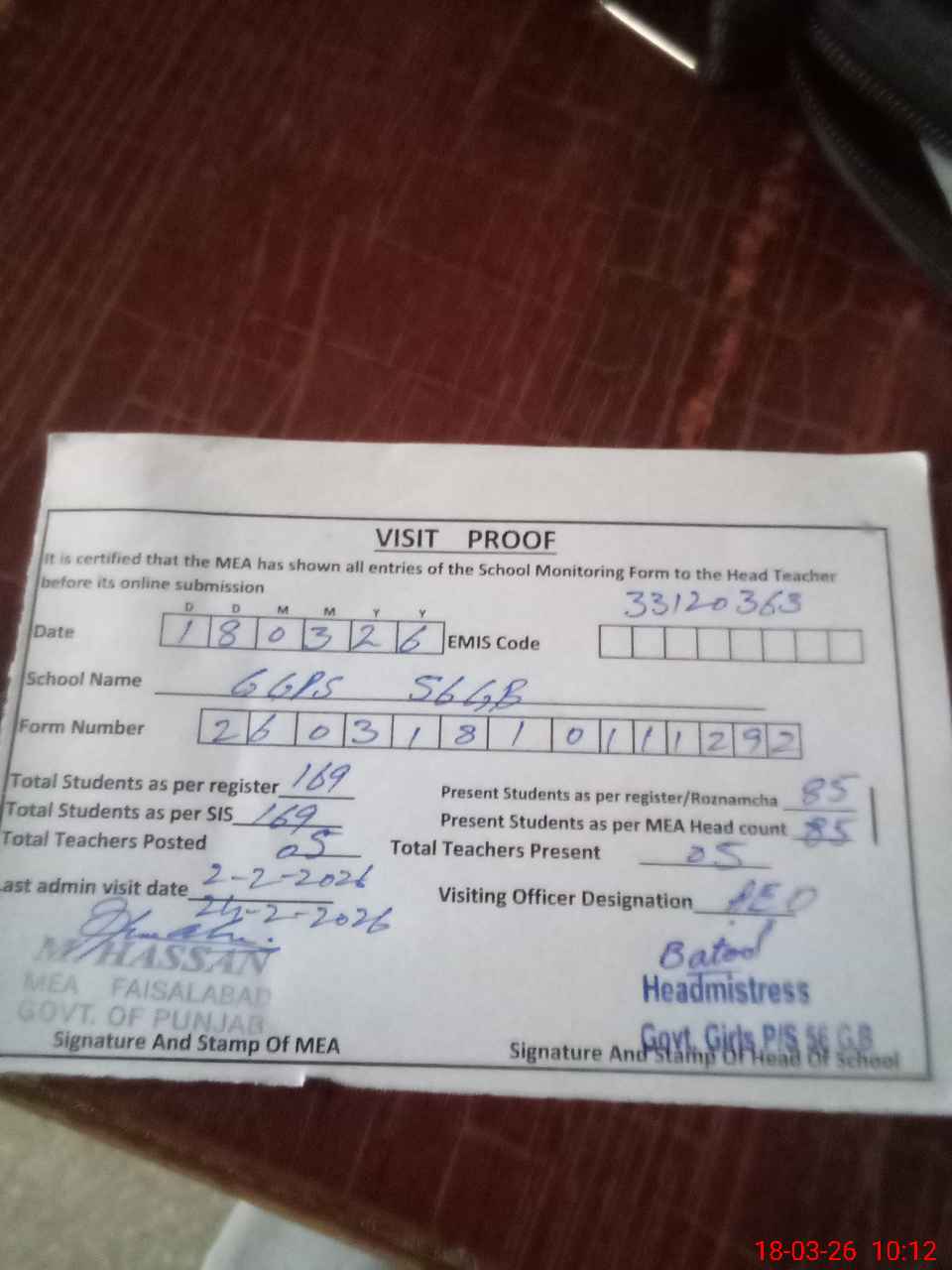 | Attendance Register | Head Teacher | MEA with School | Visit Proof |
