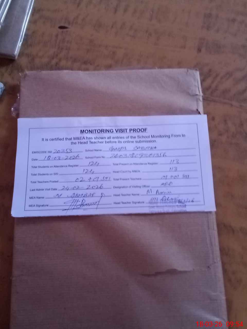 | Attendance Register | Head Teacher | MEA with School | Visit Proof |