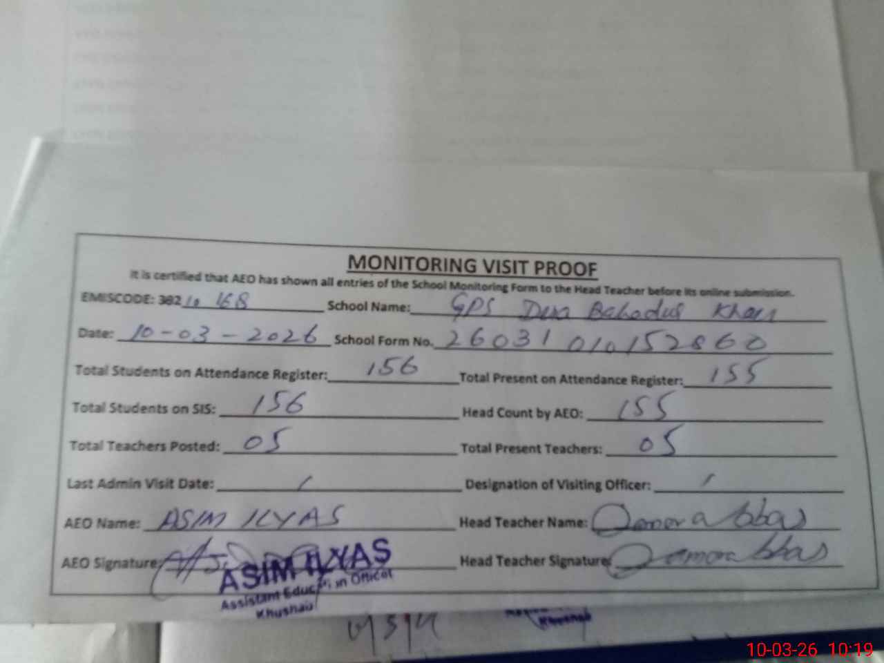 | Certified that this School was Inspected by the Undersigned MEA/DMO Today and the Information Stated Above is as Per Record. | |||||